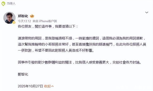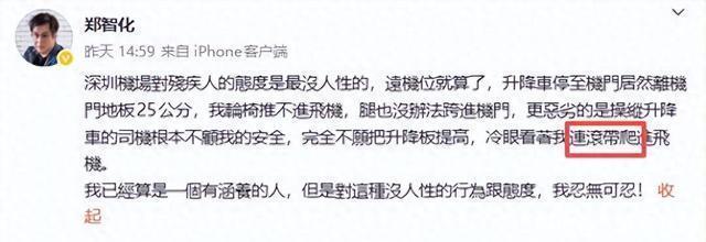 10月27日消息,大伙儿今天都刷到郑智化机场事件的后续了吗? 小雷这两天天看着舆论从一边倒的指责,到监控曝光后的反转,再到郑智化本人道歉,心里只剩一声叹息。 原本以为是残障人士遭遇不公的维权事件,最后却变成了名人夸大其词引发的舆论风波。 先给没跟上节奏的朋友再捋捋时间线。10月25号下午,郑智化发微博说自己在深圳机场登机时遭了罪,升降车和机舱门差了25公分,轮椅推不进去,腿也跨不过去,司机还冷眼旁观, 逼得他“连滚带爬”上飞机,怒斥这行为“没人性”。